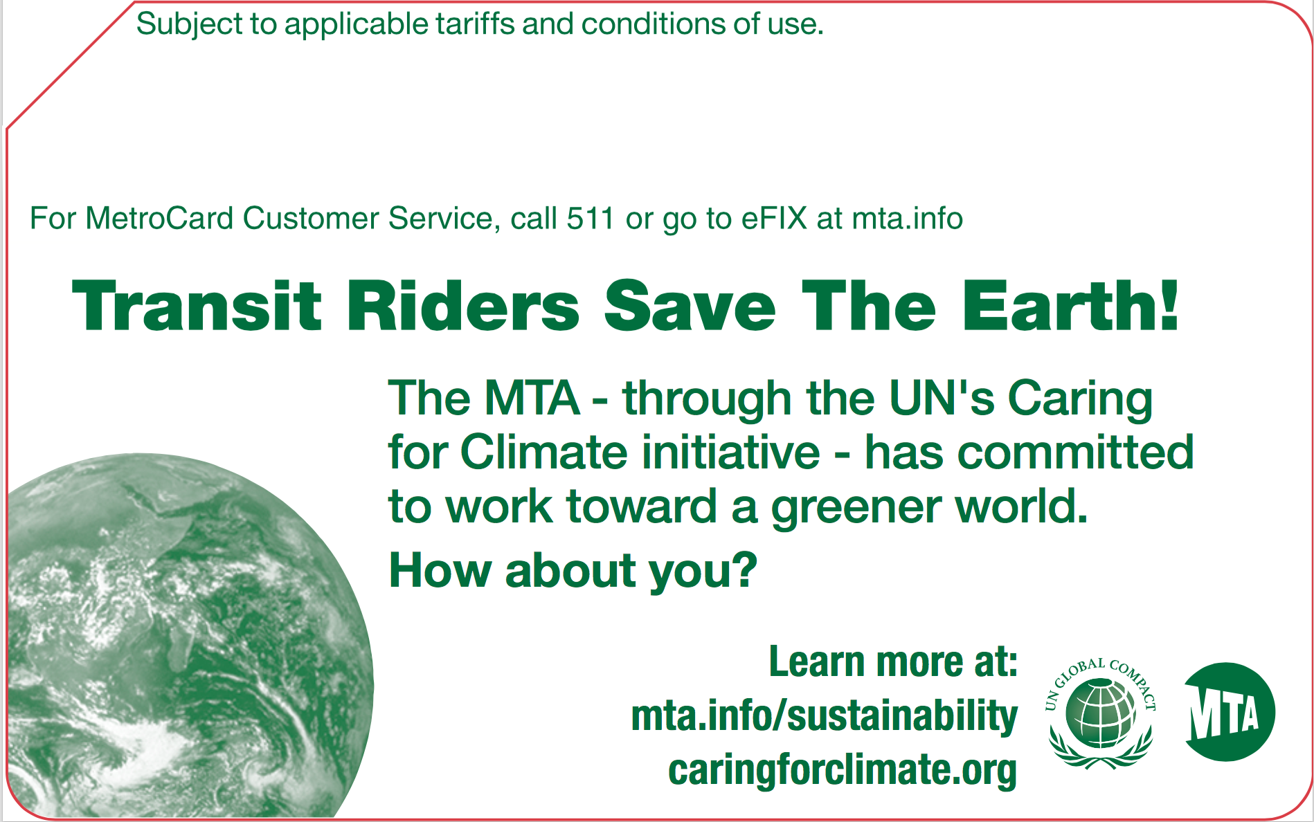 The MTA – which services over 8 million passengers per day – recently joined Caring for Climate, the UN’s initiative for business leadership on climate change. The special edition cards mark the MTA’s continuing efforts to address climate change by featuring a special green print and the message: "The MTA - through the UN's Caring for Climate initiative - has committed to work toward a greener world. How about you?"