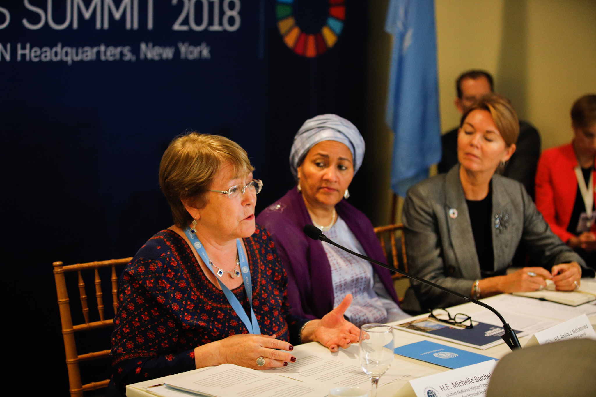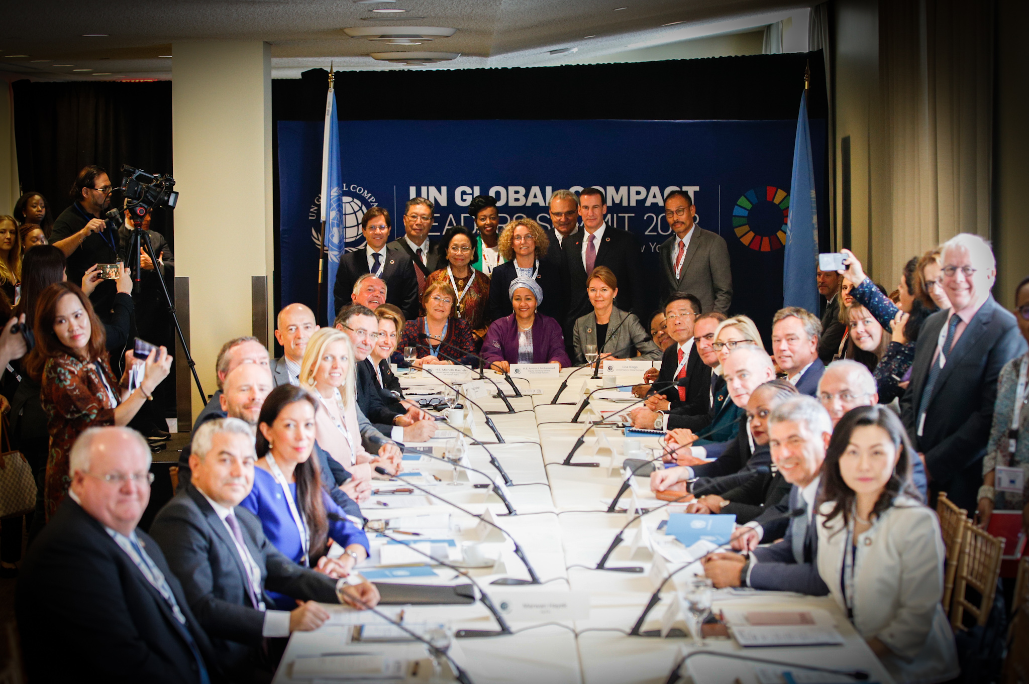 UN High Commissioner for Human Rights, Michelle Bachelet, with Deputy Secretary-General of the UN, Amina Mohammed, and CEO & Executive Director of the UN Global Compact, Lise Kingo, with global business leaders at the CEO Roundtable of the UN Global Compact Leaders Summit 2018.