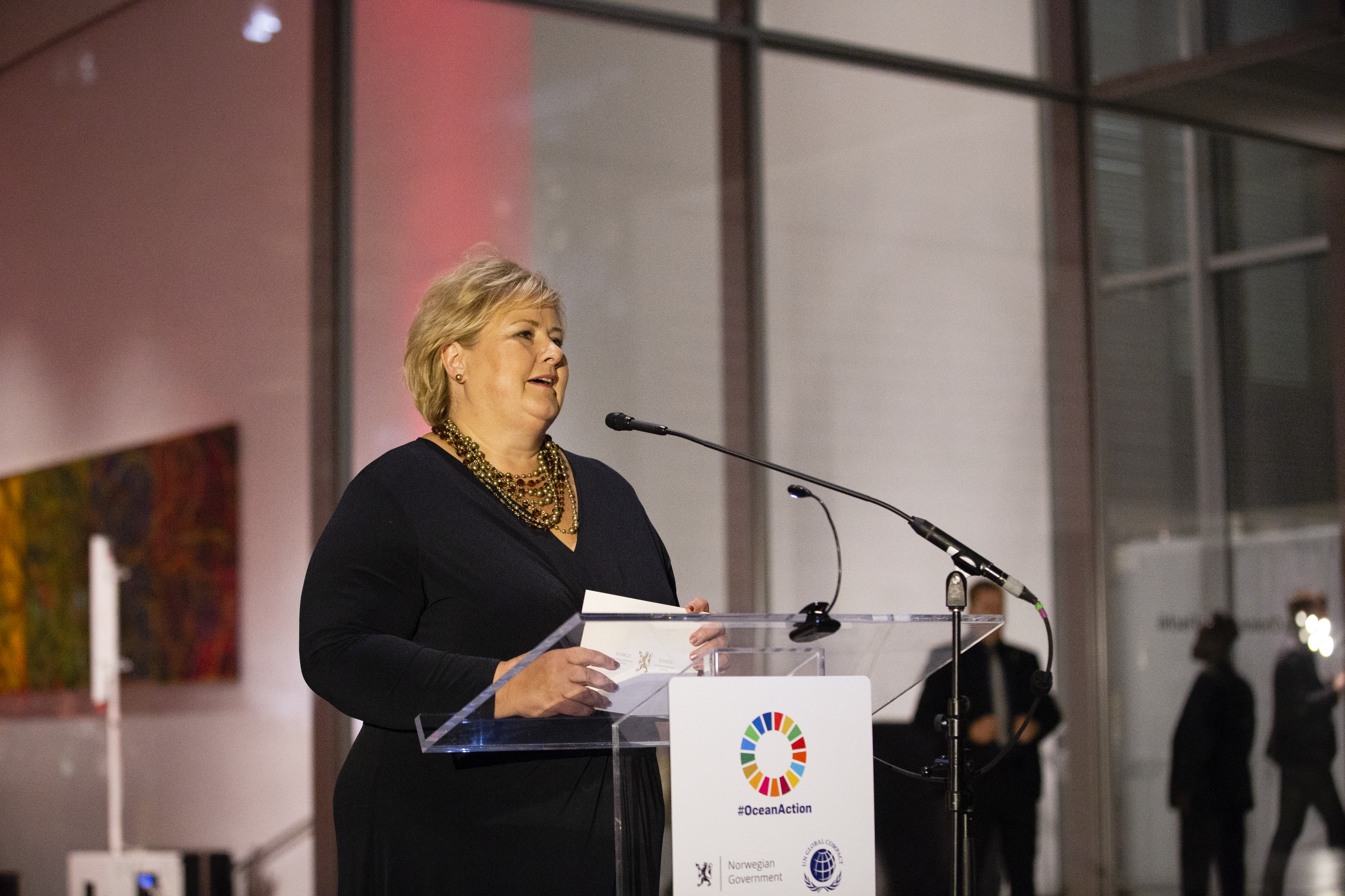 Erna Solberg, Prime Minister of Norway, speaking at the UN Global Compact Leaders Summit Reception.