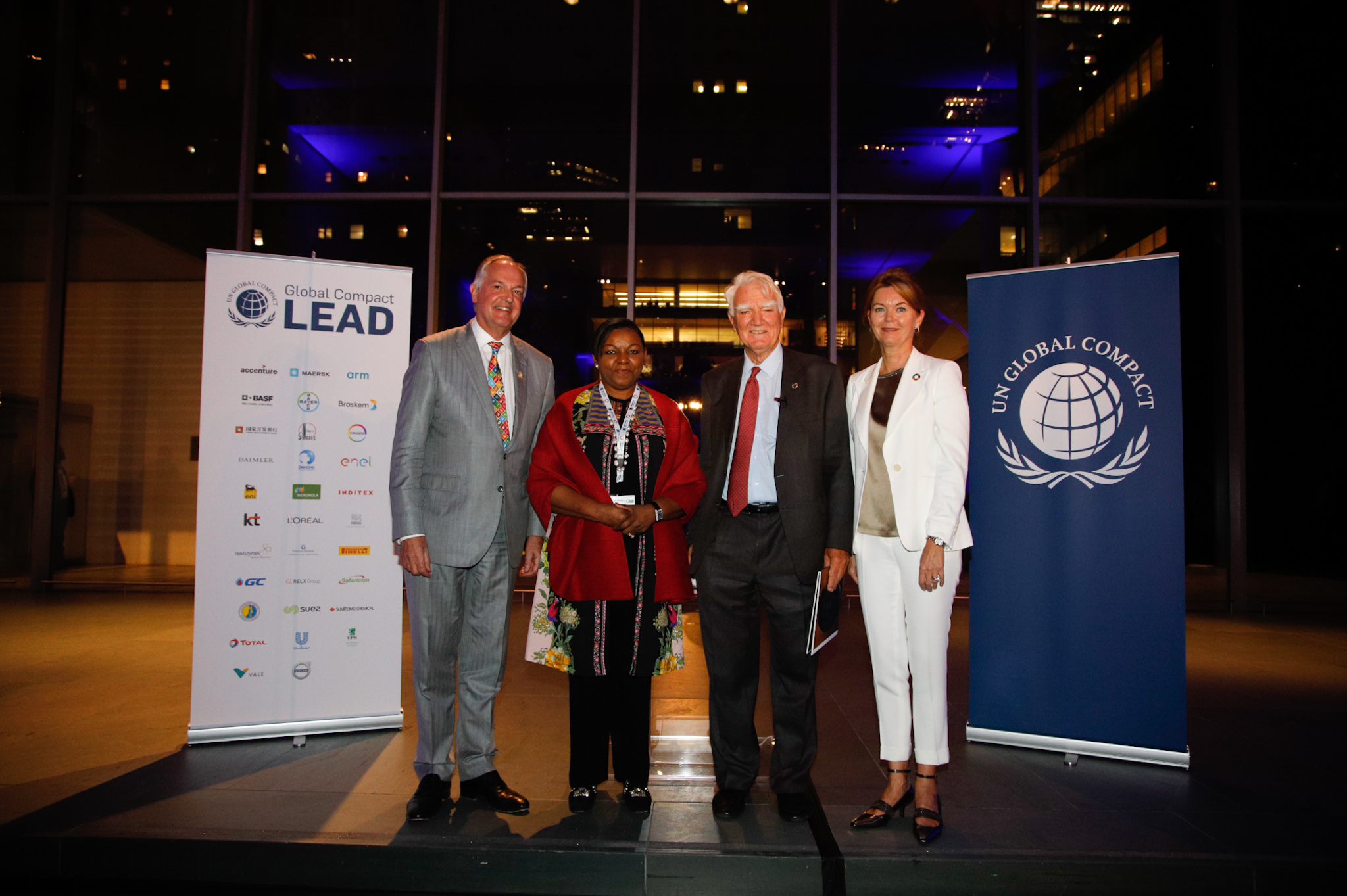 UN Global Compact Board Vice Chairs Paul Polman, CEO of Unilever and Bola Adesola, Managing Director and CEO, Standard Chartered Bank Nigeria (left), join Sir Mark Moody Stuart (outgoing Vice Chair) and CEO & Executive Director of the UN Global Compact, Lise Kingo at the UN Global Compact Leaders Summit Reception.