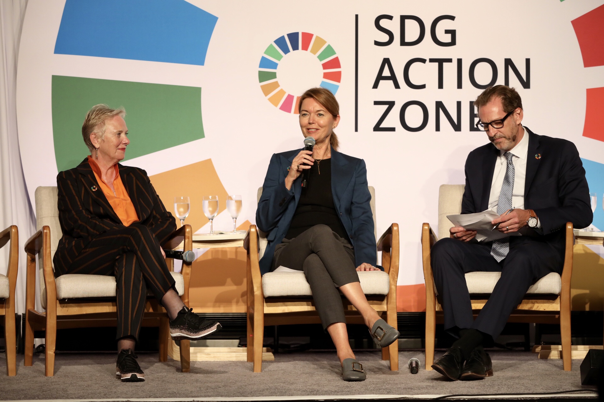 Lise Kingo, CEO and Executive Director of the UN Global Compact and Ann Cairns, Executive Vice Chairman of Mastercard taking part in a discussion moderated by Robert Skinner, Executive Director of the UN Office for Partnerships at the Trailblazing Women Reception on the sidelines of the UN General Assembly.